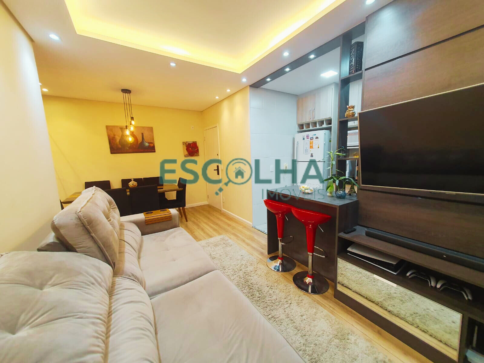 - Sala com painel moderno e aconchegante
